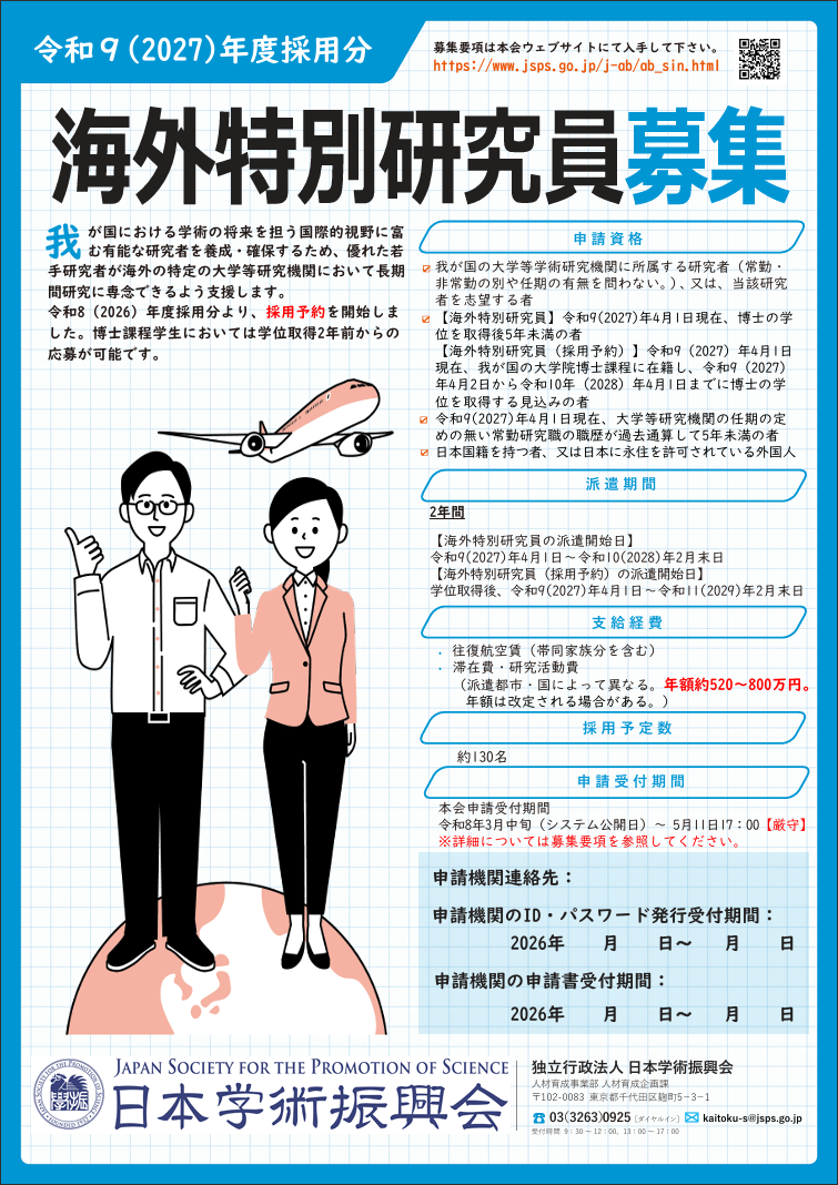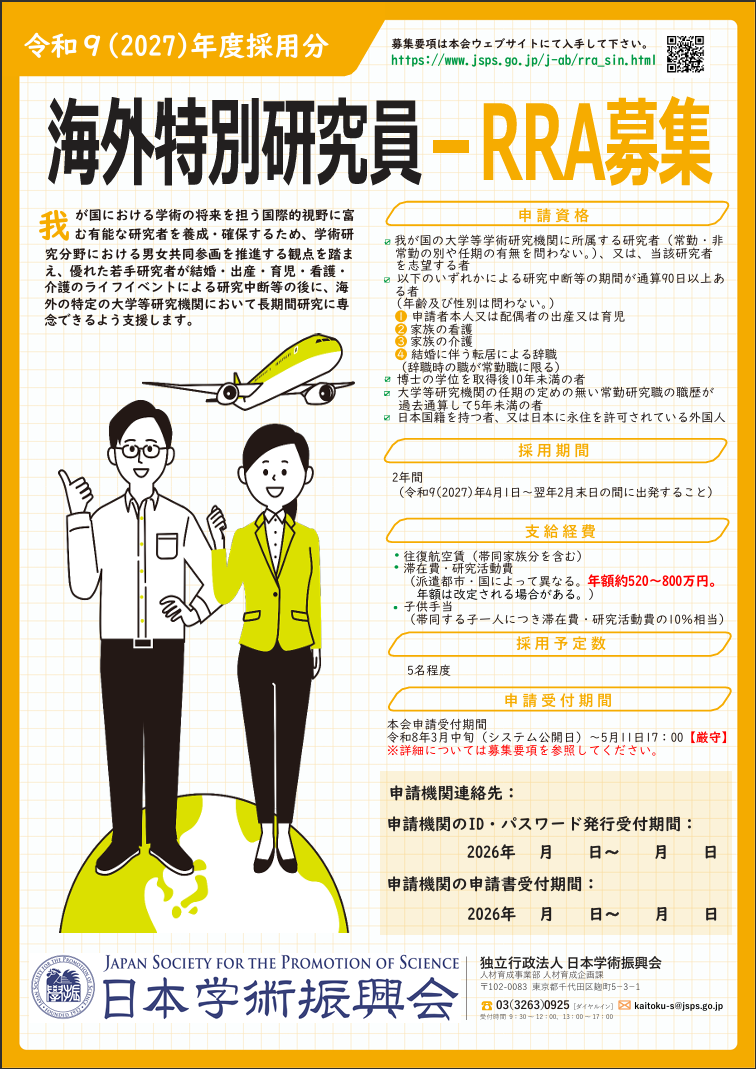 令和9(2027)年度採用分海外特別研究員、海外特別研究員RRAの募集について