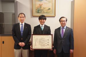 11月2日(水)に学長室において、弦間学長と安武医学部長とで、その功を称えました。今回の経験は、大佐古さんにとって、将来の糧となることでしょう。