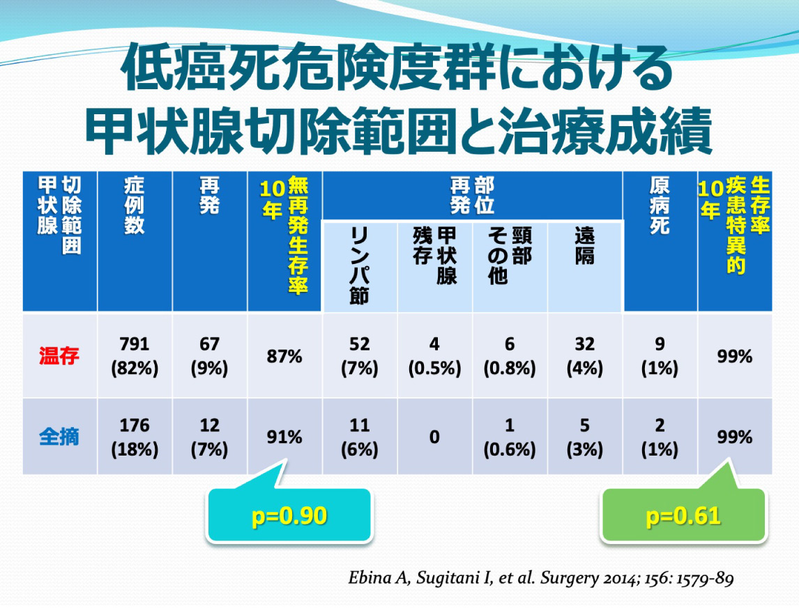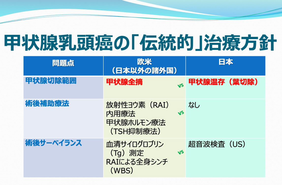 概して術後の予後のよい甲状腺癌について、欧米では甲状腺の全摘出が推奨されてきました。一方で日本では、QOL重視の観点から甲状腺温存手術が積極的に行われてきました。こうしたコンサバティブな傾向から、日本では世界に先駆けて、とくにリスクの低い無症候性の微小乳頭癌に対するアクティブサーベイランス(非手術経過観察)の臨床試験が行われました。その良好な成績に基づき、米国甲状腺学会のガイドラインも「手術をしないで経過をみる」治療を採用しています。