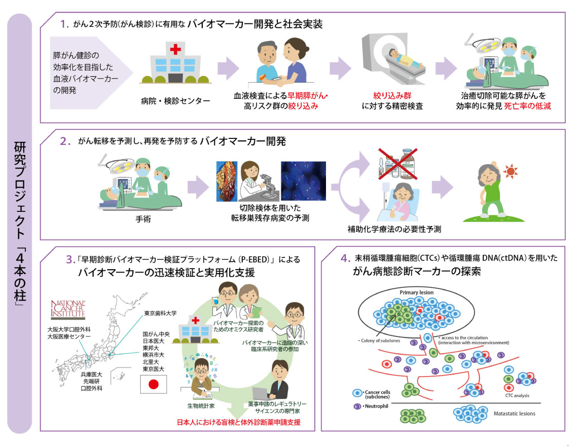③ については、腫瘍細胞から逸脱して血液中を循環する末梢循環腫瘍細胞や未循環腫瘍DNAに着目し、末梢循環腫瘍細胞回収等のプロジェクトを進めています。