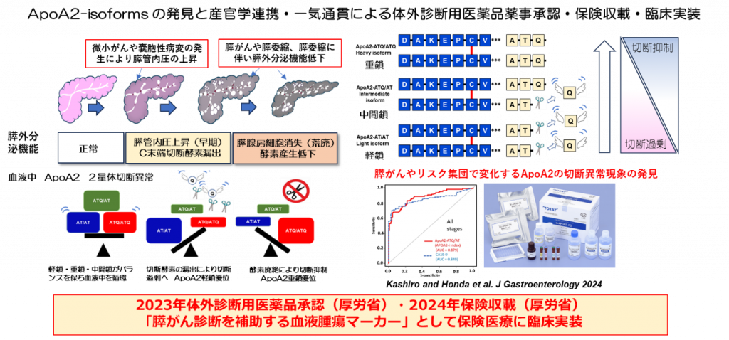 - 関連特許を東レ(株)にライセンス、共同研究により体外診断用医薬品「東レAPOA2-iTQ」の臨床開発に成功、承認、保険収載に至った。「膵がん診断を補助する腫瘍マーカー」として保険医療を受けることができる。