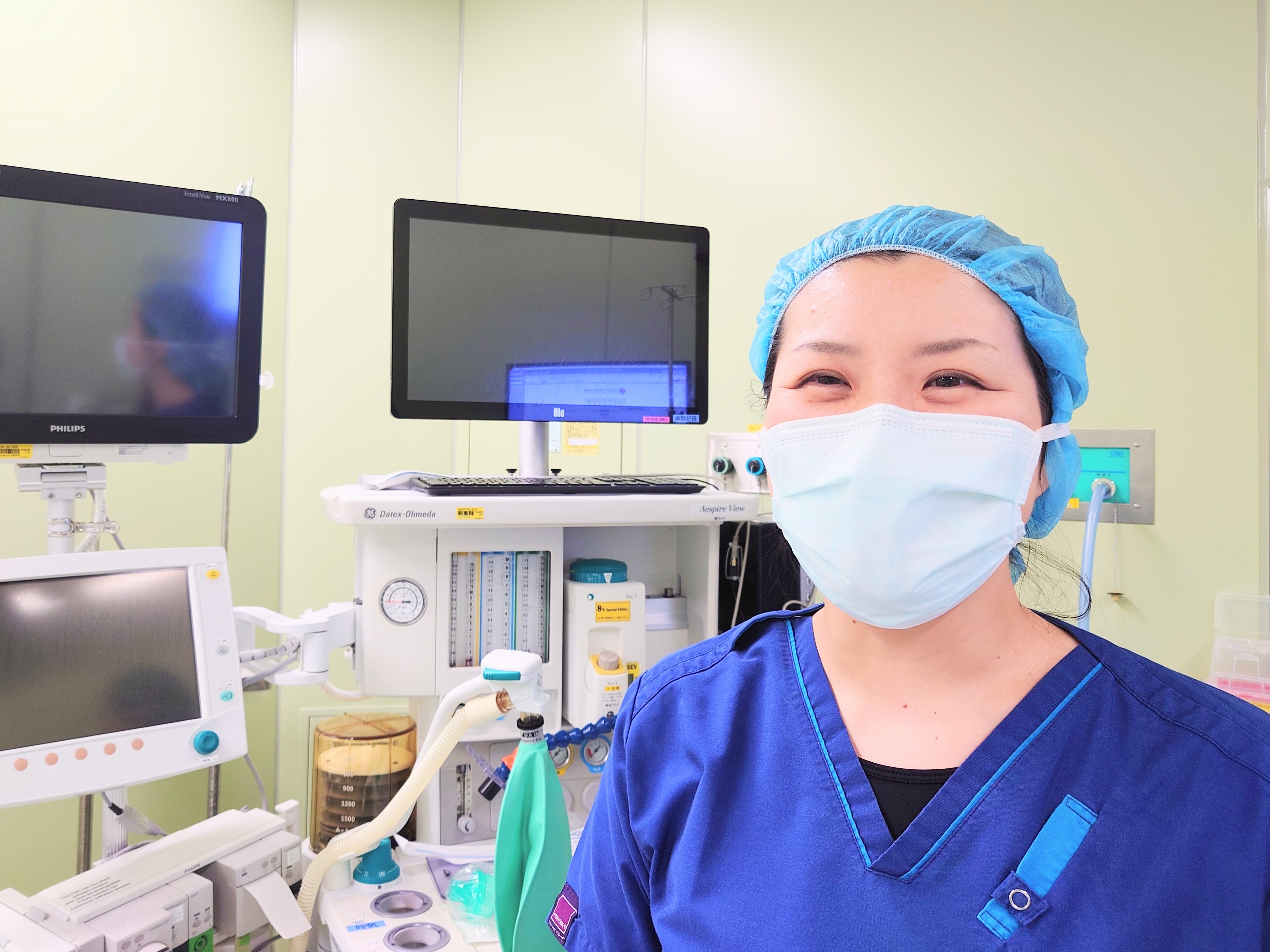 私は入職時に消化器・呼吸器外科病棟で勤務し、4年前に手術室に異動しました。異動当初は右も左も分からず大変でしたが、医師や同僚スタッフの皆さんに助けてもらいながら頑張ることができました。育児中の看護師が多く、私も子育て真最中で先輩ママパパさんに子育てについても相談に乗ってもらい、仕事以外の面でもとても心強い存在です。
